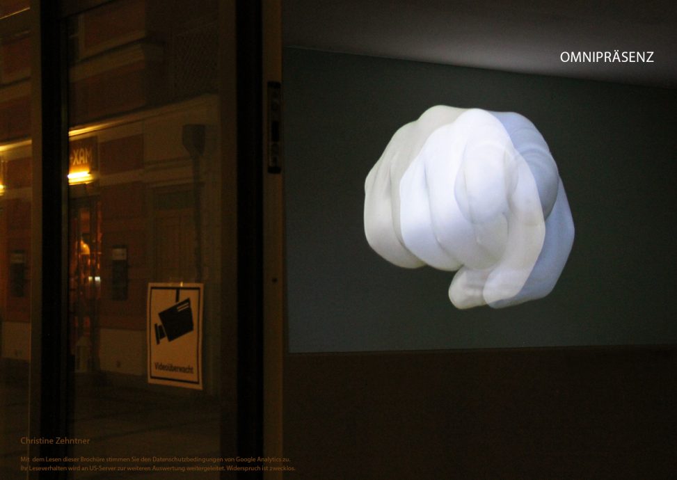 Die Projektion zielt auf die individuelle Wahrnehmung der Situation durch den Betrachter ab. Jede Person erlebt die Verfolgung durch den weißen und steril wirkenden Finger anders, was einen Spielraum für individuelle Interpretationen und Erfahrungen schafft. Ist der Finger neutral? Schützt oder bedroht er? Auf jeden Fall beobachtet er. Wer ist er? Ich selbst? Die Polizei? Facebook? Google? Der Arbeitgeber? Freunde? Die Überwachungskamera?